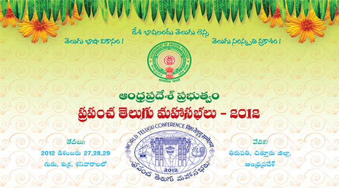 Now the time has come up once again to quote Sri Krishna Devaraya's eminent quote "Desa Bhashalandu Telugu Lessa" (among the nations all languages, Telugu is the best). Yes, we will be celebrating the 'World Telugu Conference" from Dec. 27, 28, & 29, 2012 at Tirupati with utmost gaiety and grandeur. This prestigious event is being organized by the Government of Andhra Pradesh.